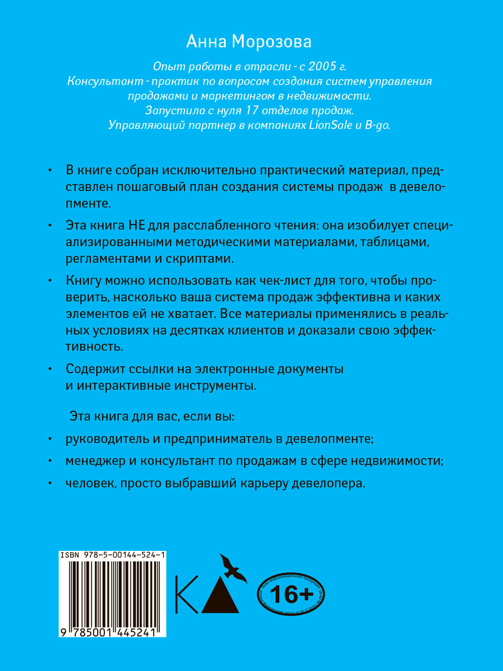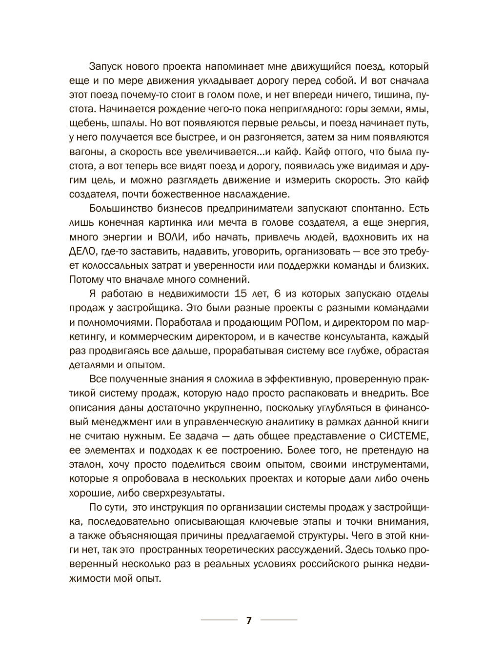 Большинство бизнесов предприниматели запускают спонтанно. В начале пути много сомнений, новый проект требует колоссальных материальных затрат или поддержки команды и близких. Еще лучше, когда рядом есть наставник, который уже прошел этот путь и готов за руку провести вас к желаемому результату. Анна Морозова - консультант - практик по вопросам создания систем управления продажами и маркетингом в недвижимости сложила в своей книге все полученные знания в эффективную, проверенную практикой систему продаж, которую надо просто распаковать и внедрить. Ее задача - дать общее представление о системе, ее элементах и подходах к ее построению. По сути, это инструкция по организации системы продаж у застройщика, последовательно описывающая ключевые этапы и точки внимания, а также объясняющая причины предлагаемой структуры. Чего в этой книги нет, так это пространных теоретических рассуждений. Здесь только проверенный несколько раз в реальных условиях российского рынка недвижимости опыт автора.
