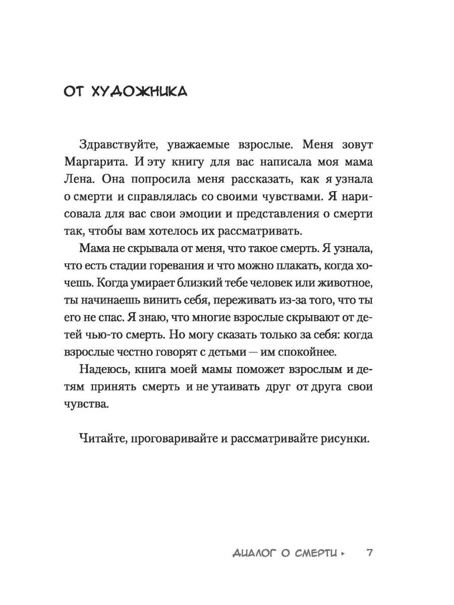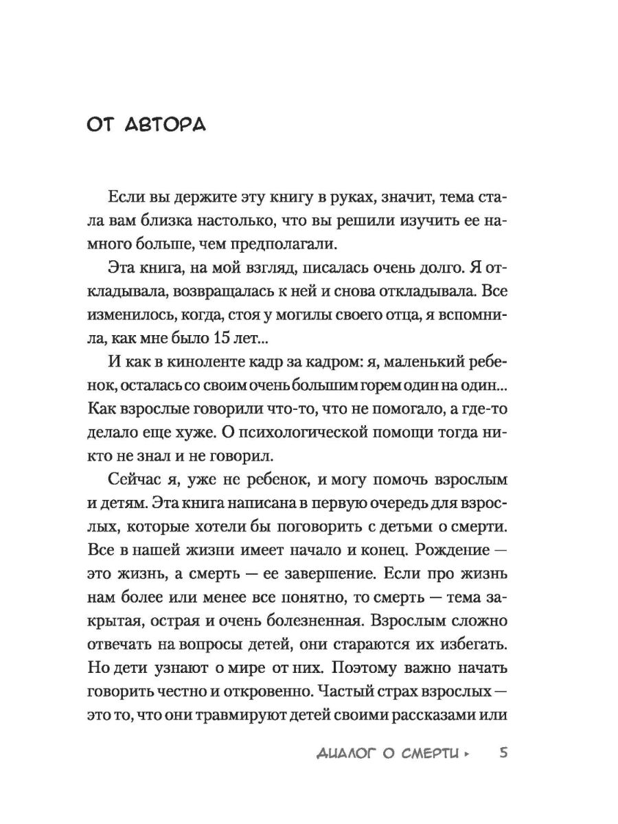 "Диалог о смерти" подходит как для взрослых, так и для подростков, предлагает непростые, но необходимые для понимания истины о жизни после смерти и о том, как важно научиться справляться с горем. Эта книга — не только источник знаний, но и возможность взглянуть на утрату с новой стороны, понять стадии принятия и процесс горевания в психологии.