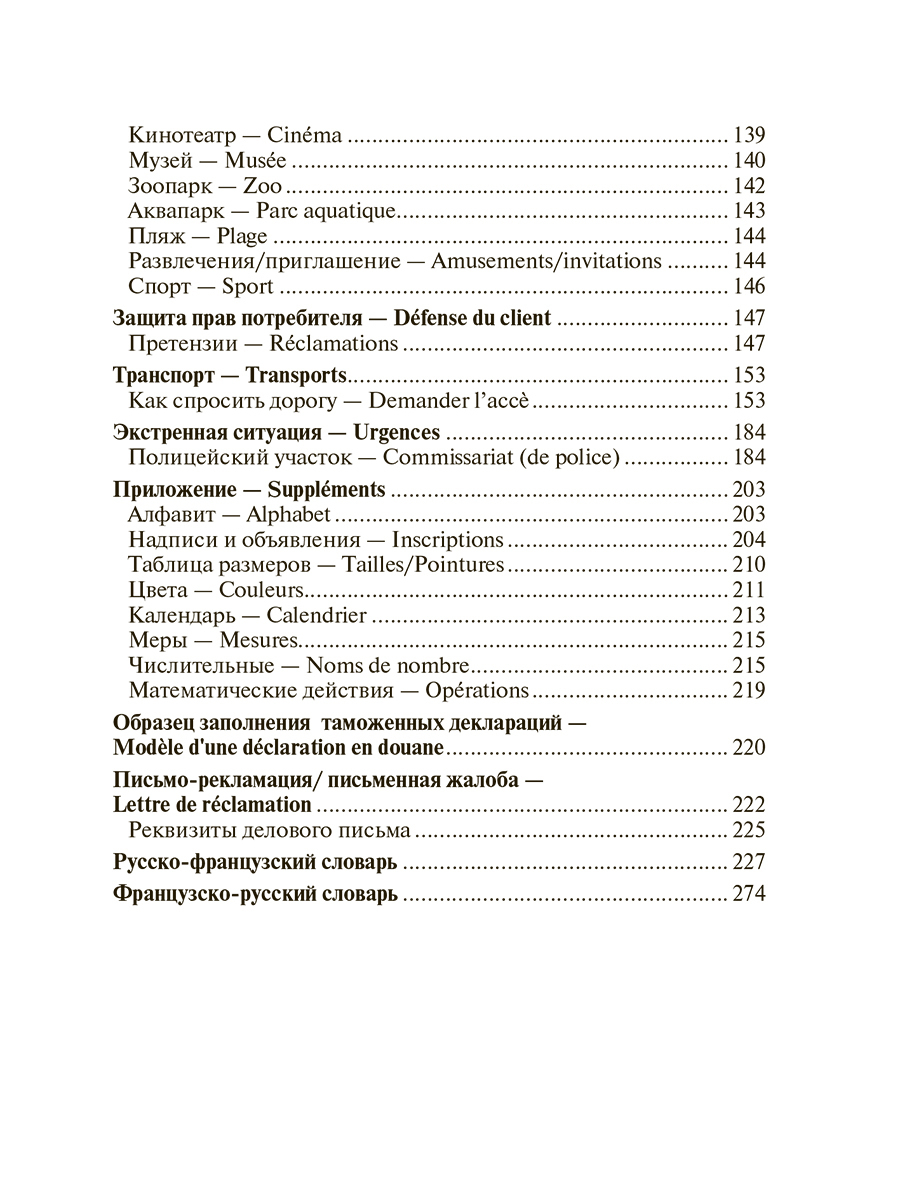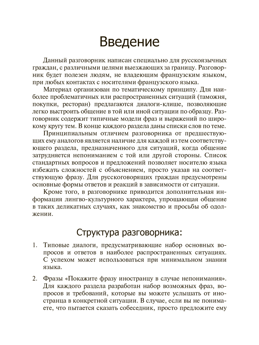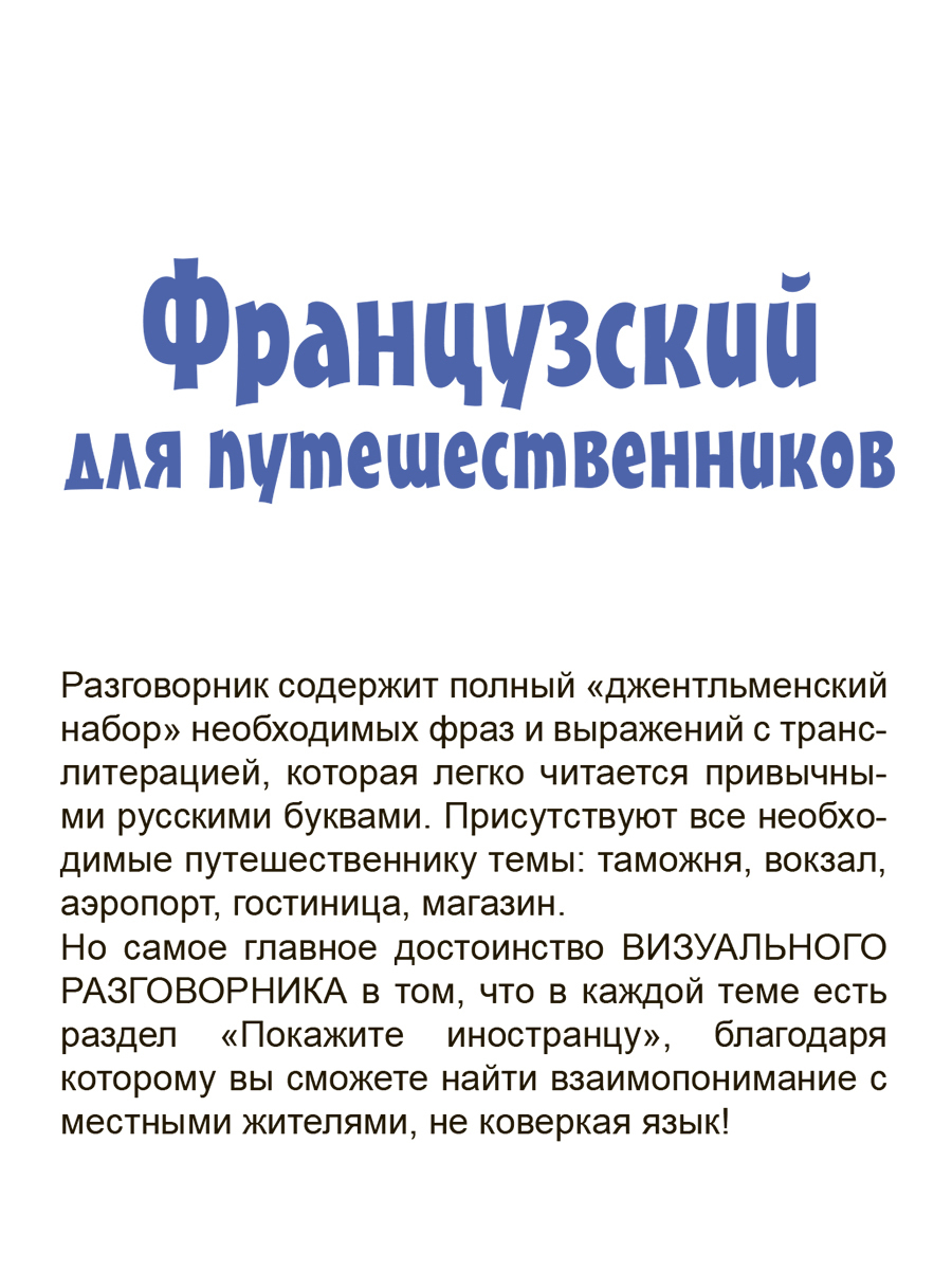 Разговорник содержит самые популярные для общения темы и предназначен для российских граждан, с различными целями выезжающих за границу. Для наиболее распространенных ситуаций, а также проблематичных (таможня, покупки, ресторан) предлагаются диалога-клише, позволяющие легко выстроить общение в той или иной ситуации по образцу.