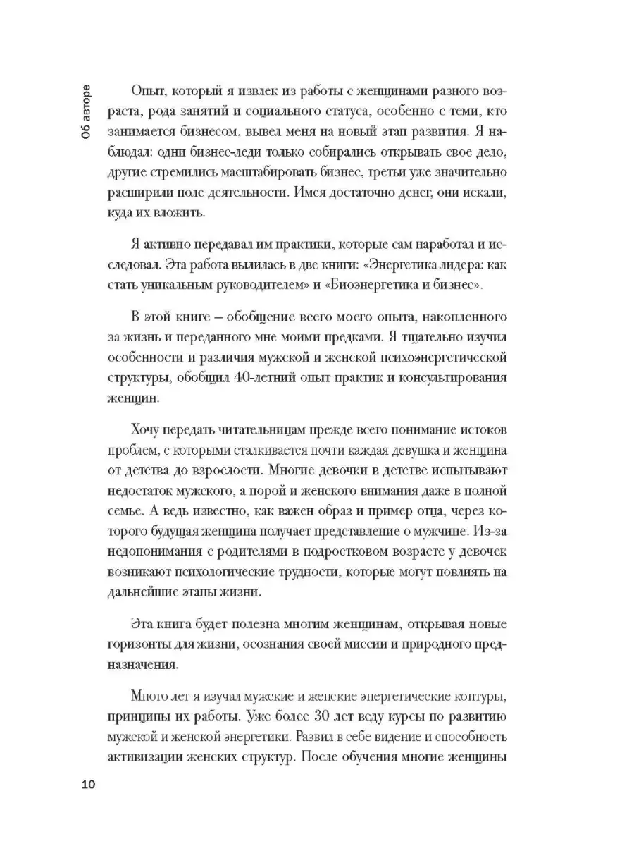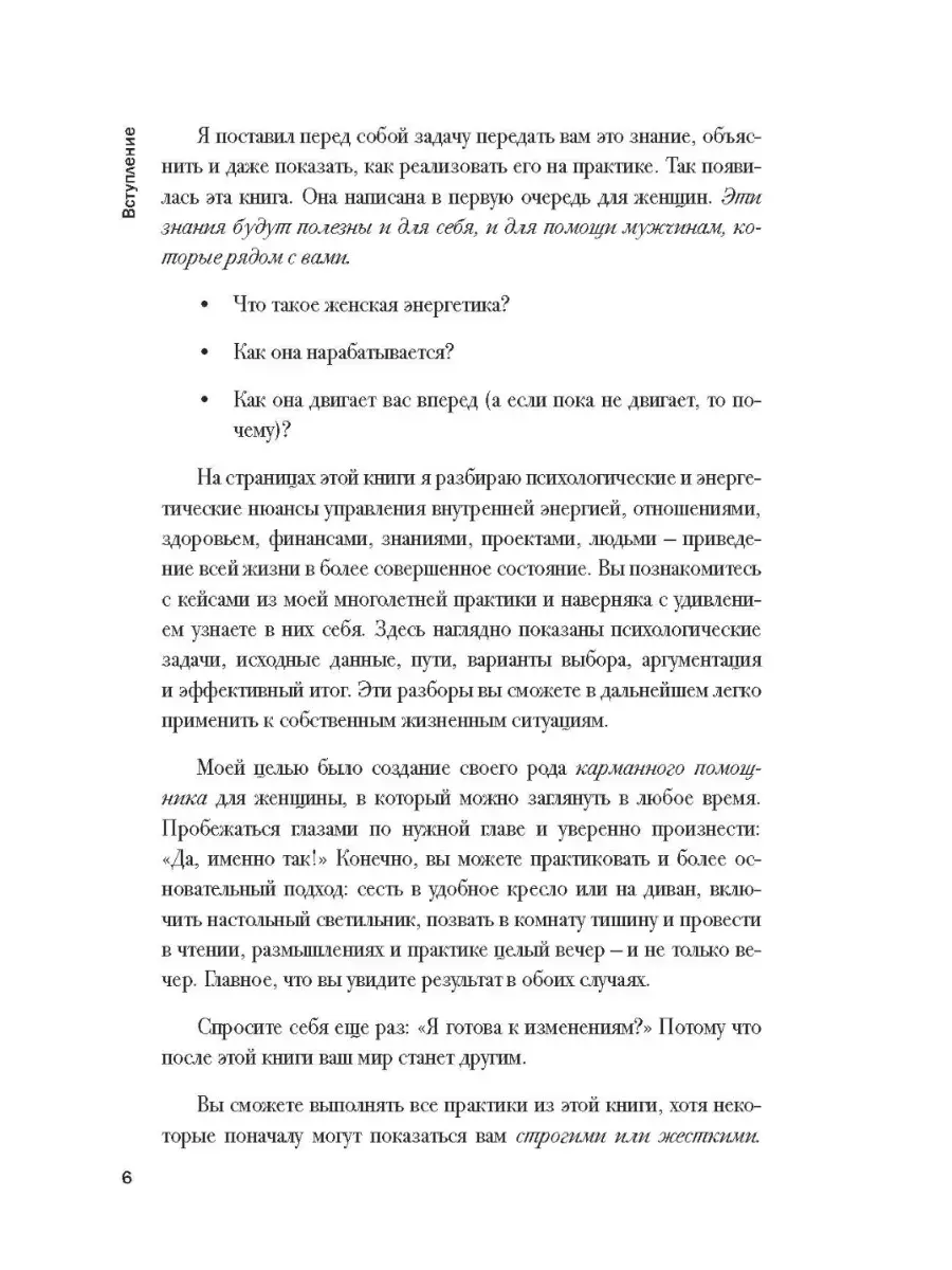 Эта книга для тех, кто многого достиг и задумался о своем предназначении, смысле и целях для нового этапа жизни. Она покажет вам, как отдавать себя, а не расходовать, наполняться энергией, а не терять ее, излучать, стать музой для мужчин и всего окружения. Практики, приведенные в книге, научат вас не болеть и тратить меньше времени на сон с полным восстановлением. Высокий уровень энергии — это привлекательность в глазах мужчин в любом возрасте, стройность, внешнее омоложение и новое ощущение тела. Это другая реальность и точка отсчета, при которой вы получите энергию на исполнение желаний и избавление от того, что забирает жизнь и радость. Я долго думал над названием: