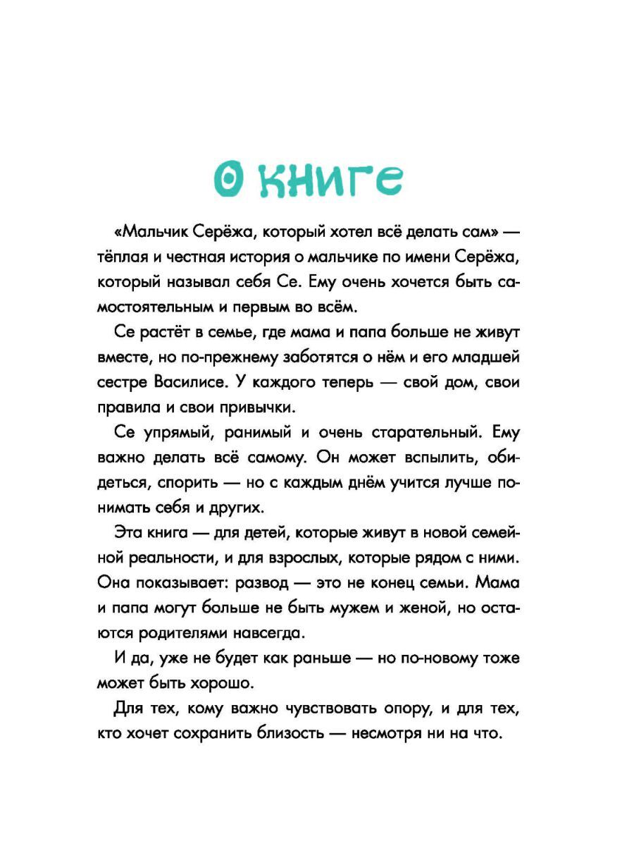 Мальчик Серёжа, который хотел всё делать сам» — это тёплые и искренние истории про мальчика по имени Се, который учится быть самостоятельным, понимать свои чувства, справляться с обидой и находить общий язык с младшей сестрой. А главное — он узнаёт, что любовь родителей остаётся с ним, даже несмотря на то, что мама и папа больше не живут вместе.