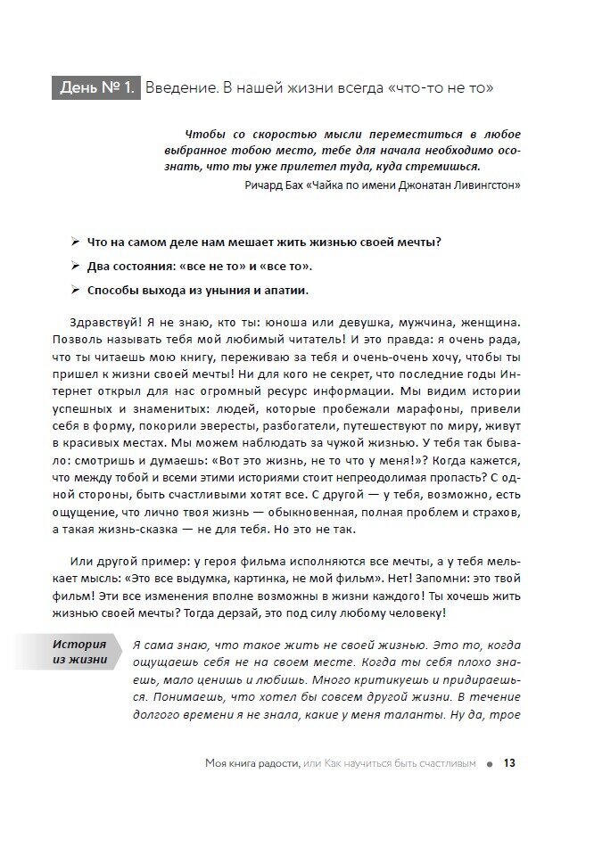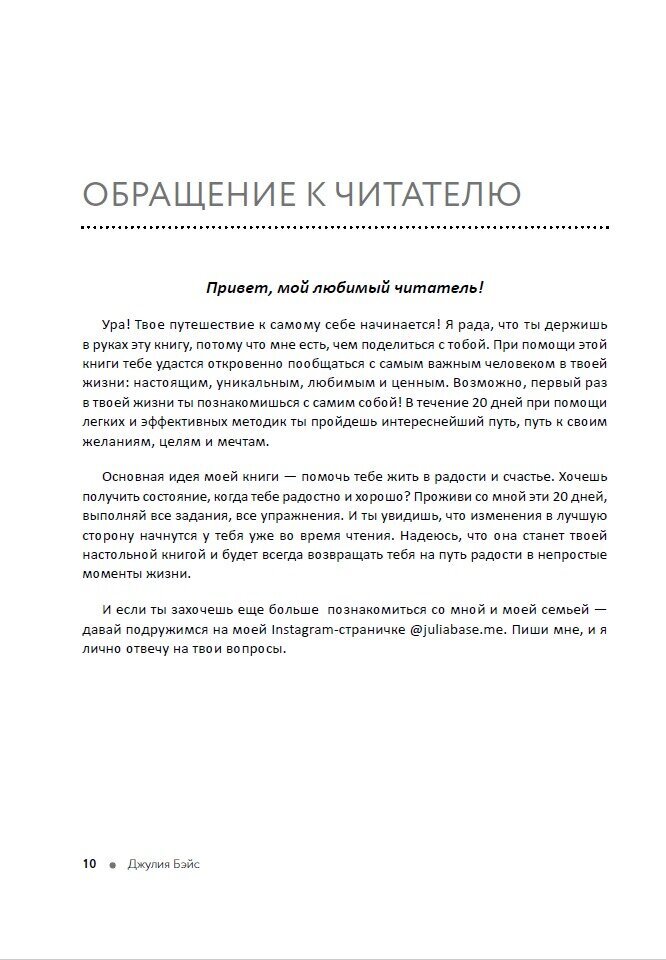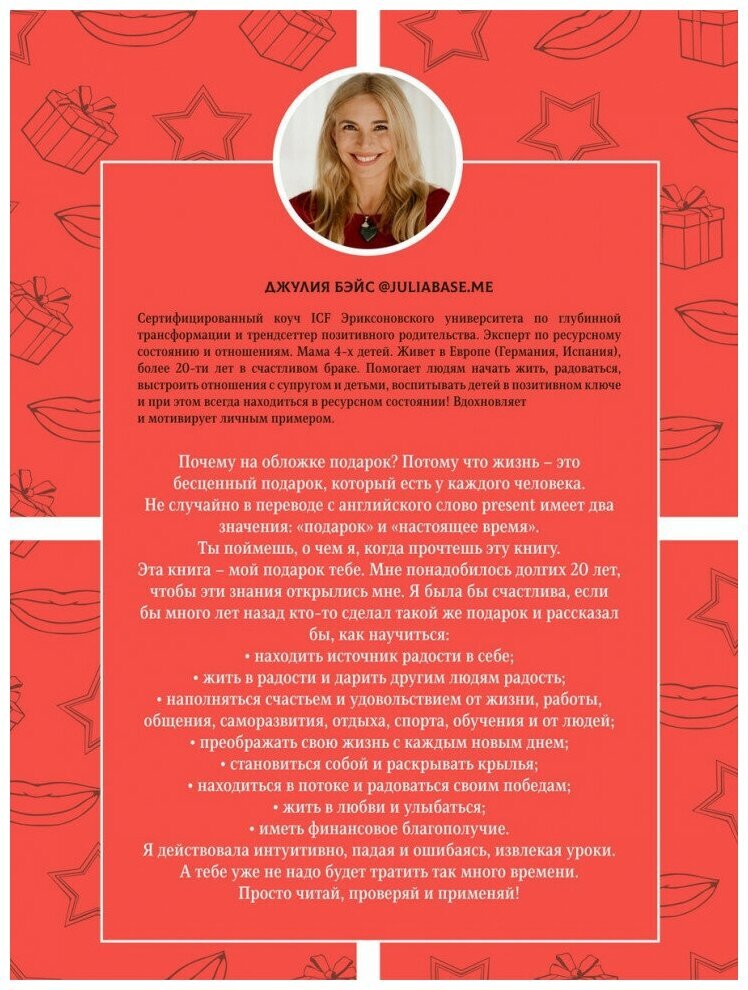 Книга Джулии Бэйс - это мотивационная книга от издательства 1000 Бестселлеров. Настольная книга для женщин, которые стремятся к саморазвитию и позитивной энергии. Джулия - сертифицированный коуч ICF Эриксоновского университета, эксперт по глубинным личным трансформациям, саморазвитию и отношениям, изучает разные эмоциональные состояния, вдохновляет и мотивирует собственным примером. Простым и легким языком автор затрагивает основные фундаментальные принципы построения правильного мировоззрения. Развивает самоанализ, умение задавать себе корректные вопросы. В книге о психологии вы узнаете, что мешает нам радоваться, откуда берутся мысли, что такое радость и материальный достаток. В произведении о любви к себе автор расскажет вам как управлять воспоминаниями, о позитивной энергии мечты и вере в чудо. Эта книга о женственности - подарок автора вам. Ей понадобилось 20 лет, чтобы эти знания открылись ей. Она действовала интуитивно, падая и ошибаясь, извлекая уроки. А вам уже не нужно тратить так много времени. Просто читайте, проверяйте и применяйте! Книга о саморазвитии отпечатана на офсетной бумаге в твердом переплете и подойдет в качестве подарка подруге, коллеге и конечно же себе любимой.