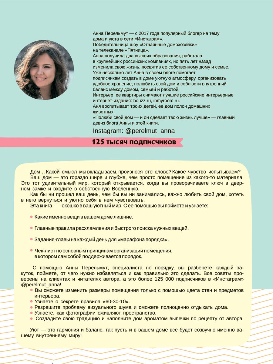 С помощью Анны Перельмут, специалиста по порядку, вы разберете каждый закуток, поймете от чего нужно избавляться и как правильно это сделать. Вы сможете изменить размеры помещения только с помощью цвета стен и предметов интерьера. Узнаете о секрете правила "60-30-10". Разрешите проблему визуального шума и сможете полноценно отдыхать дома. Узнаете как фотографии оживляют пространство. Создадите свою традицию и наполните дом ароматом выпечки по рецепту автора.