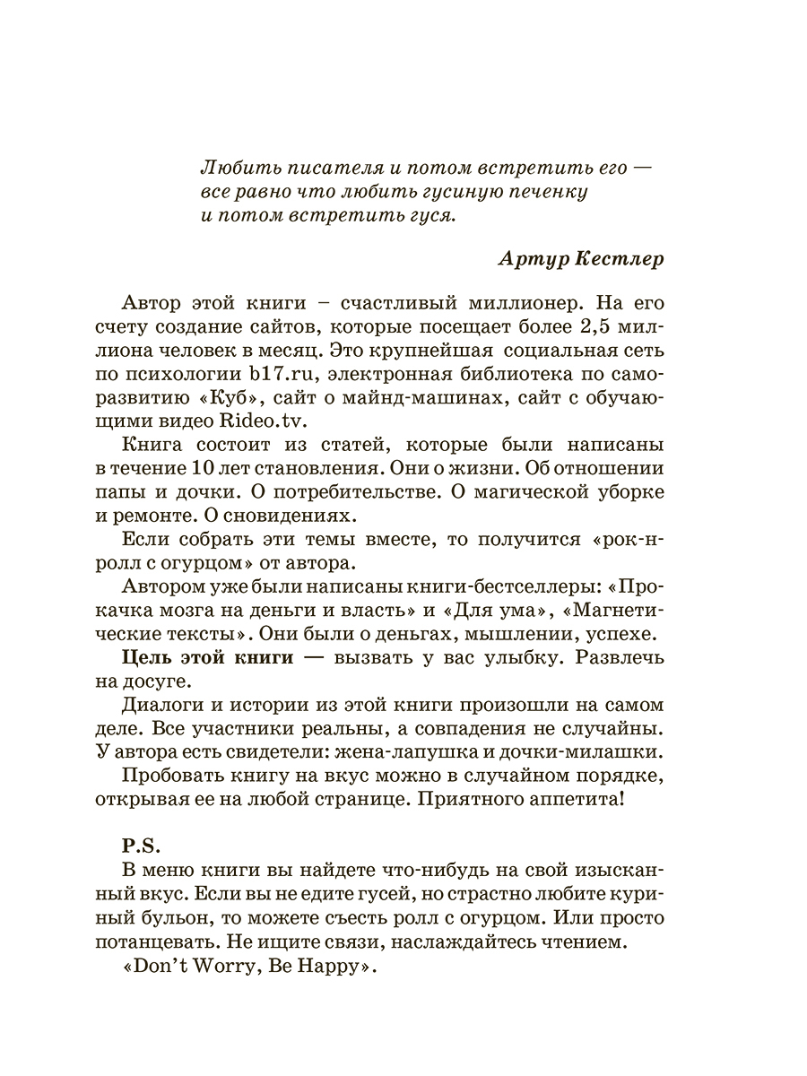 Автор этой книги - счастливый миллионер. На его счету создание сайтов, которые посещает более 2,5 миллиона человек в месяц, крупнейшая социальная сеть по психологии, электронная библиотека по саморазвитию Куб, сайт о майнд-машинах, сайт с обучающими видео. Книга состоит из статей, которые были написаны в течение 10 лет становления автора. Они о жизни, об отношении папы и дочки, о потребительстве, магической уборке и ремонте. Они очень разные, как и все в семье Никоновых. Когда еще у вас будет возможность побывать в гостях у настоящего миллионера. Узнать, как он думает, живет, распоряжается временем. Чем интересуется, как относится к деньгам и людям. Читайте и заряжайтесь на радость и успех. Будьте счастливыми миллионерами.