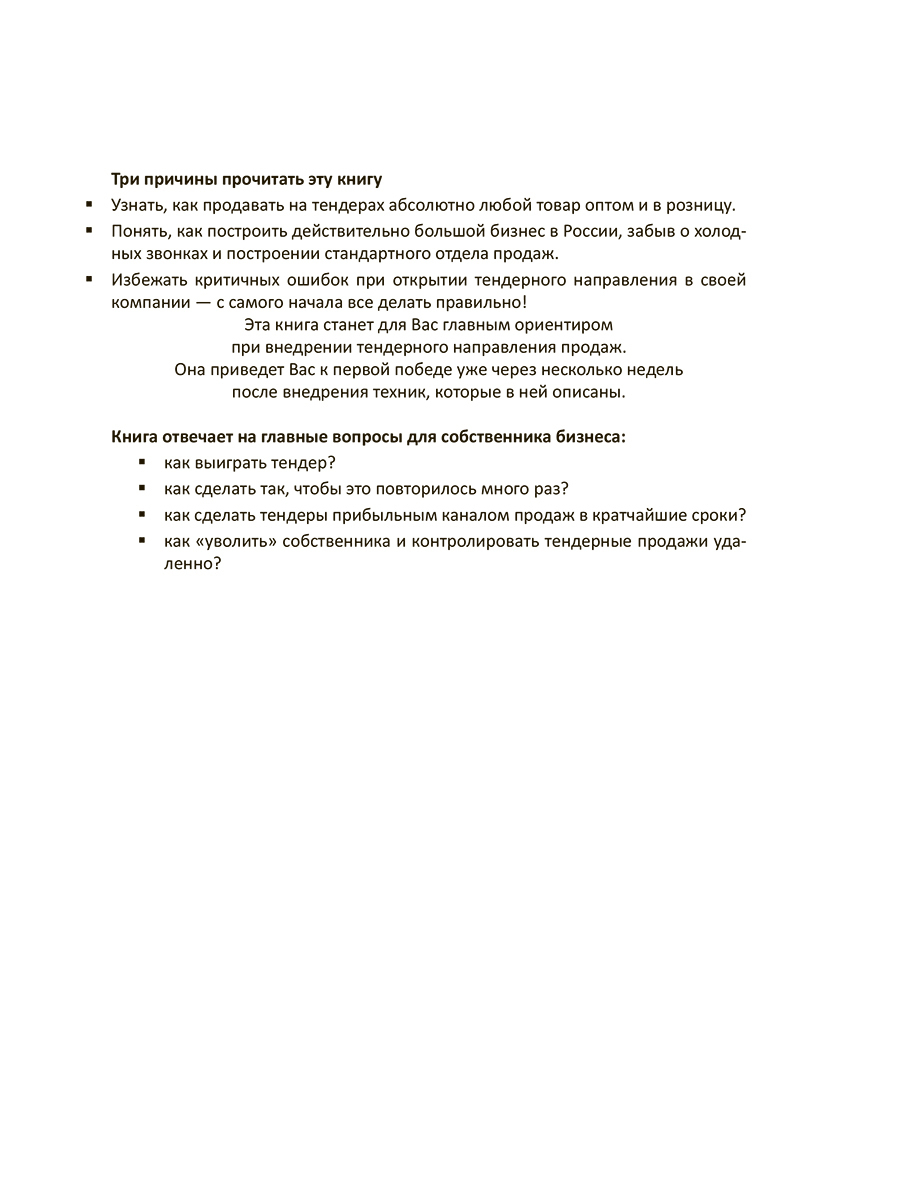Если вы мечтаете о том, чтобы Ваш бизнес наконец-то вырос из малого или микробизнеса в большой и сильный, начните изучение темы тендерных продаж с этой книги. Получив новые знания, вы сможете с максимальной эффективностью продавать любой товар, работы или услуги на российских электронных тендерах, оптом и в розницу. Узнаете, как построить тендерный отдел с вашим минимальным участием и без рисков. А если вы уже начали внедрение тендерного канала - поймете, что делали до сих пор неправильно и как достичь максимизации выручки.