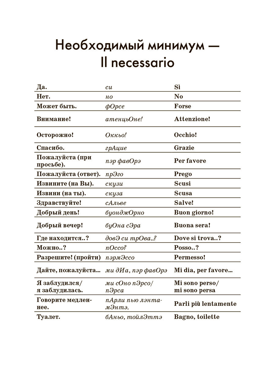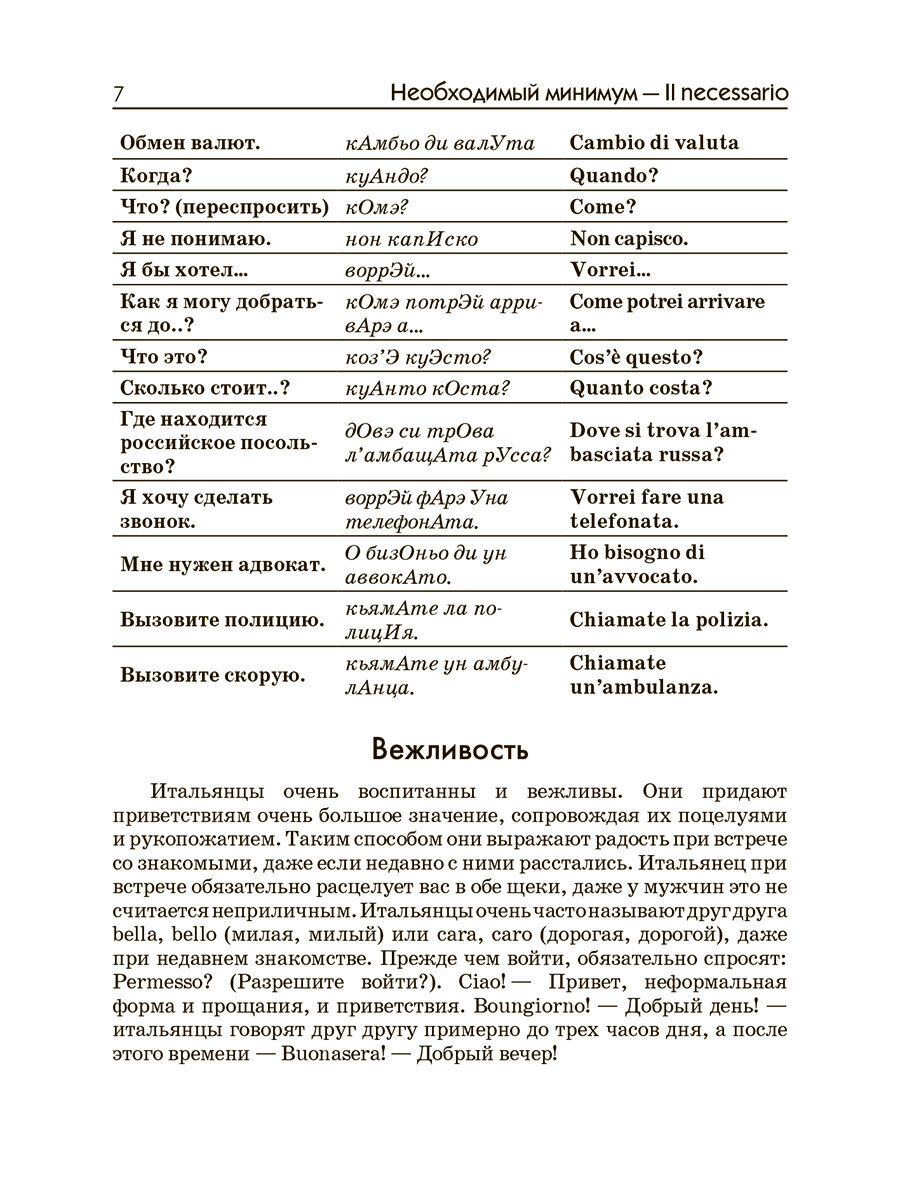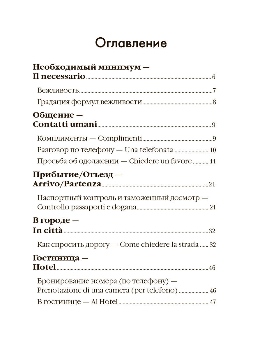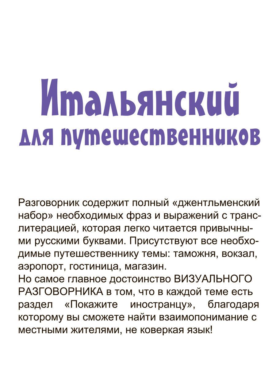 Разговорник содержит самые популярные для общения темы и предназначен для российских граждан, с различными целями выезжающих за границу. Для наиболее распространенных ситуаций, а также проблематичных (таможня, покупки, ресторан) предлагаются диалоги-клише, позволяющие легко выстроить общение в той или иной ситуации по образцу. Разговорник содержит типичные модели фраз и выражений. Обратите внимание на раздел «Покажите фразу иностранцу в случае непонимания», который существенно облегчит общение с иностранцем в случае, если вам все-таки не удается понять друг друга. В конце каждого раздела даны списки наиболее употребляемых слов по теме, чтобы не заучивать их, а просто использовать, когда это необходимо.