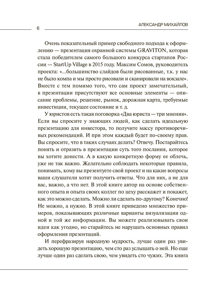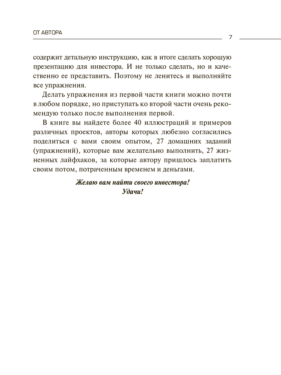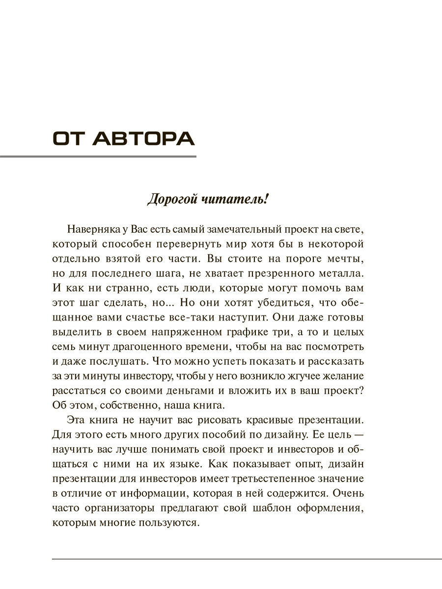 Попасть в акселератор, выиграть в конкурсе, получить грант, привлечь инвесторов - для всего этого нужно иметь качественную инвестиционную презентацию и уметь хорошо делать питч. Конечно, даже супер-презентация не спасёт слабый проект, но гораздо чаще случается, что замечательные проекты не могут найти финансирование из-за плохих презентаций. В этой книге автор, прошедший школу нескольких акселераторов и победивший во многих престижных конкурсах делится секретами успешной презентации и убойного питча. Это практическое пособие, которое содержит пошаговую инструкцию, множество лайфхаков и практических примеров. В конце каждой главы вы найдёте упражнения, выполнив которые, вы получите не только качественную презентацию своего проекта, но и научитесь защищать его перед инвесторами. Книга будет полезна начинающим предпринимателям, основателям стартапов, руководителям технологичных проектов и всем, кто нуждается в венчурных инвестициях.